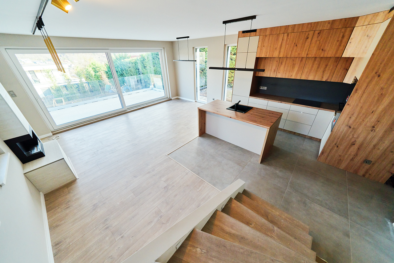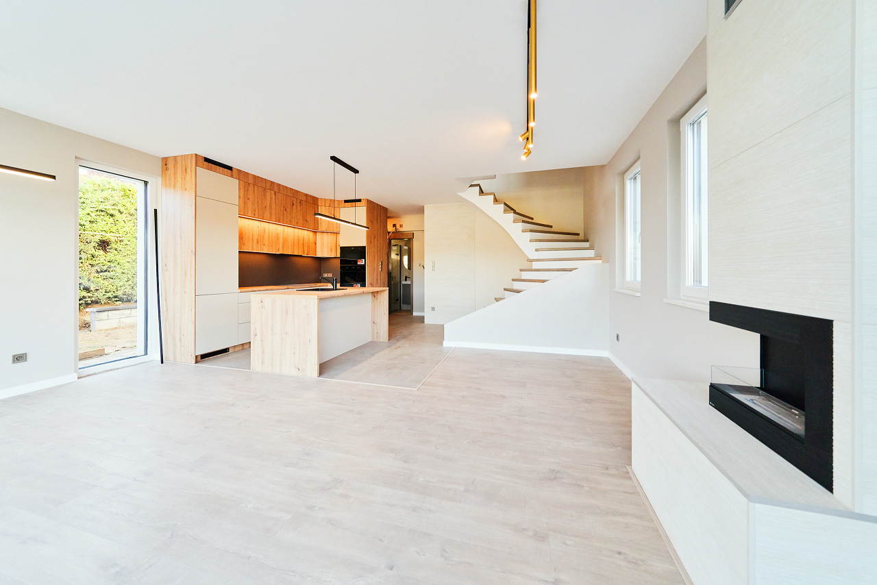 A fűtést a gépészeti helyiségben elhelyezett 10 Kw-os hőszivattyú biztosítja HMV tárolóval, mely a lakóterületek mennyezet felületének fűtését és hűtését magas energiahatékonysággal oldja meg. A hűtést és fűtést hőfokszabályozókkal lehet egyedileg szabályozni. Padlófűtést építünk be a fürdőszobákban, garázsban, tárolóban, előszobában.